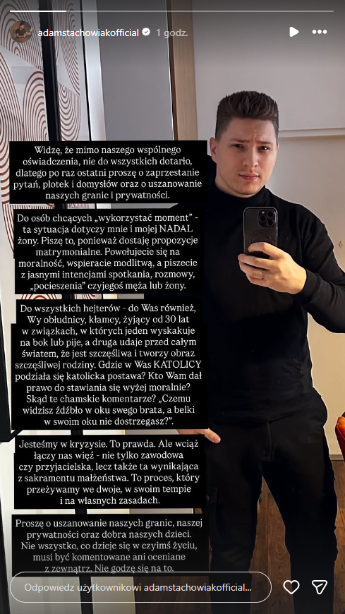 Teraz to Adam Stachowiak odezwał się do swoich obserwatorów i na Instagramie zamieścił obszerny wpis. 8 stycznia przekazał, że w sieci już dostaje propozycje od innych kobiet!